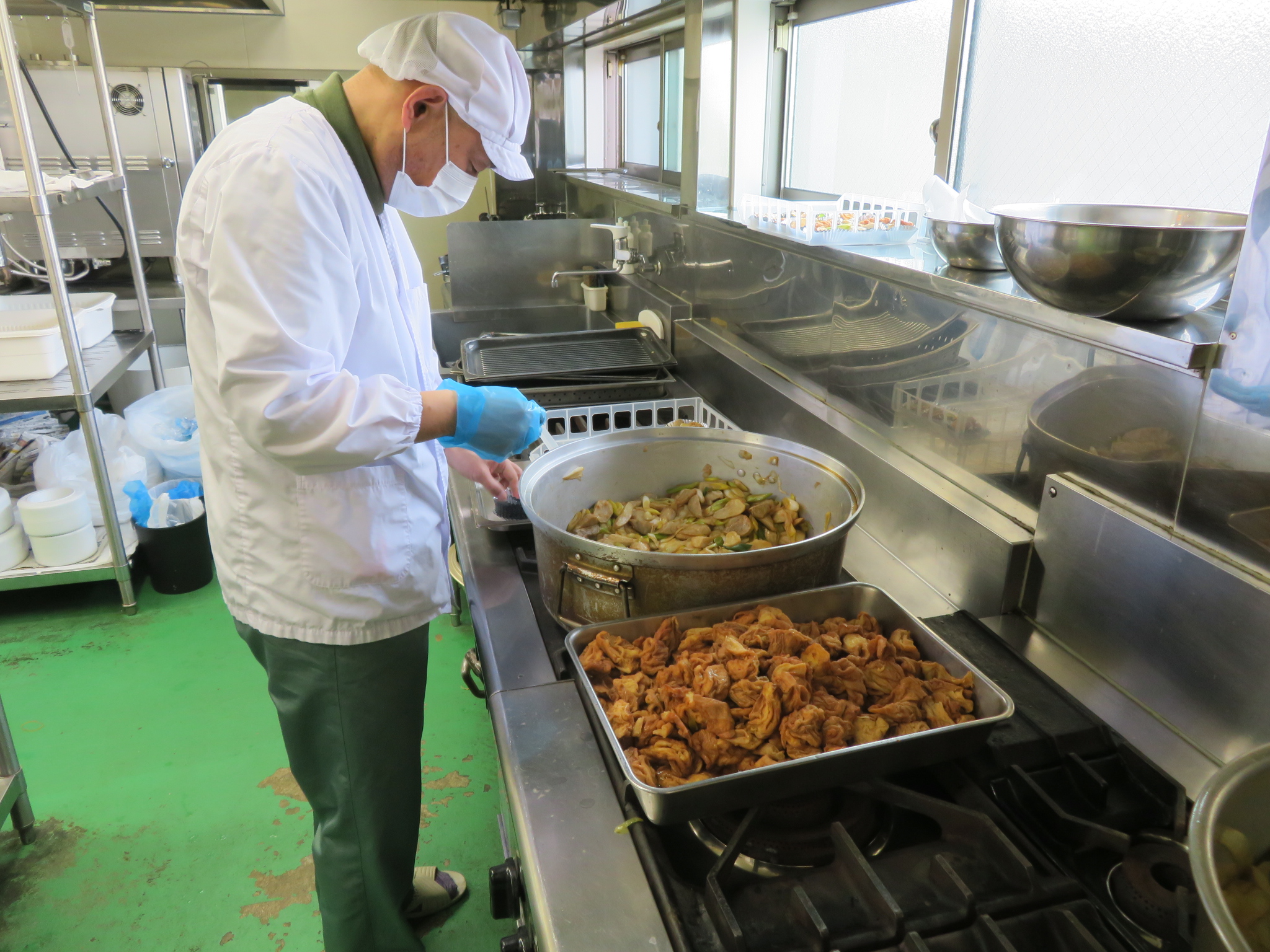 職員が作ったおかずをアルミホイルへ入れています。量を均一にする作業訓練です。
